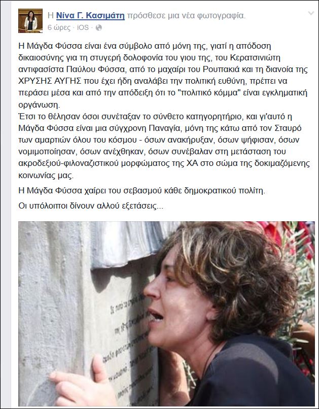 «Σύγχρονη Παναγία», χαρακτηρίζει την Μάγδα Φύσσα η Νίνα Κασιμάτη με ανάρτησή της στην προσωπική της σελίδα στο Facebook.