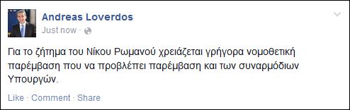 Την ανάγκη για άμεση νομοθετική παρέμβαση και από τους συναρμόδιους υπουργούς προκειμένου να δοθεί λύση στο ζήτημα που έχει προκύψει με το Νίκο Ρωμανό επισημαίνει ο Ανδρέας Λοβέρδος με ανάρτηση στον προσωπικό του λογαριασμό στο Facebook.