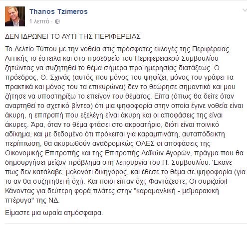 Πριν από λίγο επανήλθε, γράφοντας σε νέα ανάρτηση:«ΔΕΝ ΙΔΡΩΝΕΙ ΤΟ ΑΥΤΙ ΤΗΣ ΠΕΡΙΦΕΡΕΙΑΣΤο Δελτίο Τύπου με την νοθεία στις πρόσφατες εκλογές της Περιφέρειας Αττικής το έστειλα και στο προεδρείο του Περιφερειακού Συμβουλίου ζητώντας να συζητηθεί το θέμα σήμερα προ ημερησίας διατάξεως. Ο πρόεδρος, Θ. Σχινάς (αυτός που μόνος του ψηφίζει, μόνος του γράφει τα πρακτικά και μόνος του τα επικυρώνει) δεν το θεώρησε σημαντικό και μου ζήτησε να υποστηρίξω το επείγον του θέματος. Είπα (όπως θα δείτε όταν αναρτηθεί το σχετικό βίντεο) ότι μια ψηφοφορία στην οποία έγινε νοθεία είναι άκυρη, η επιτροπή που εξελέγη είναι άκυρη και οι αποφάσεις της είναι άκυρες. Άρα, όταν το θέμα φτάσει στο ακροατήριο, διότι είναι ποινικό αδίκημα, και με δεδομένο ότι πρόκειται για καραμπινάτη, αυταπόδεικτη περίπτωση, θα ακυρωθούν αναδρομικώς ΟΛΕΣ οι αποφάσεις της Οικονομικής Επιτροπής και της Επιτροπής Λαΐκών Αγορών, πράγμα που θα δημιουργήσει μείζον πρόβλημα στη λειτουργία του Π. Συμβουλίου. Έκανε πως δεν κατάλαβε, μολονότι δικηγόρος, και έθεσε το θέμα σε ψηφοφορία (για το αν θα συζητηθεί ή όχι). Και ποιοι είπαν όχι; Φαντάζεστε; Οι συριζαίοι! Κάνοντας για δεύτερη φορά πλάτες στην “καραμανλική – μεϊμαρακική πτέρυγα” της ΝΔ.Είμαστε μια ωραία ατμόσφαιρα».