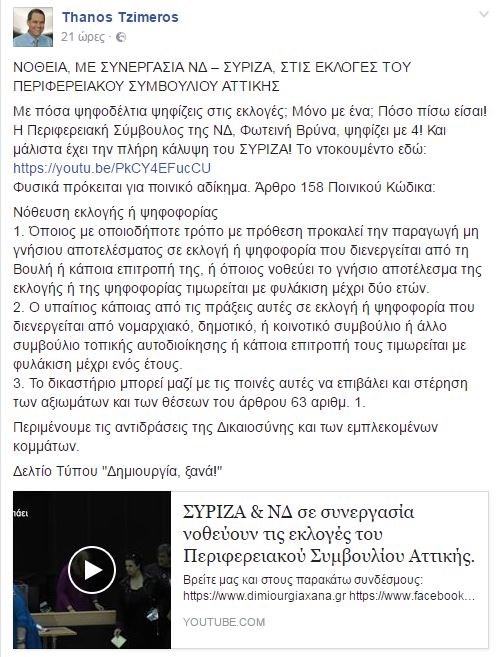 Νοθεία με συνεργασία ΝΔ-ΣΥΡΙΖΑ στις εκλογές του Περιφερειακού Συμβουλίου Αττικής καταγγέλλει ο Θάνος Τζήμερος, επικεφαλής της παράταξης «Δημιουργούμε Μαζί».«Με πόσα ψηφοδέλτια ψηφίζεις στις εκλογές; Μόνο με ένα; Πόσο πίσω είσαι! Η Περιφερειακή Σύμβουλος της ΝΔ, Φωτεινή Βρύνα, ψηφίζει με 4! Και μάλιστα έχει την πλήρη κάλυψη του ΣΥΡΙΖΑ! Φυσικά πρόκειται για ποινικό αδίκημα. Άρθρο 158 Ποινικού Κώδικα:Νόθευση εκλογής ή ψηφοφορίας