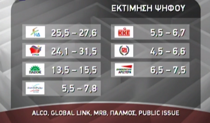 Οριακό προβάδισμα της Νέας Δημοκρατίας έναντι του ΣΥ.ΡΙΖ.Α. έδειξαν οι περισσότερες δημοσκοπήσεις που διεξήχθησαν τις τελευταίες ημέρες και οι οποίες παρουσιάστηκαν πριν από λίγο στην εκπομπή “Λαβύρινθος” της ΕΤ3.Στην πρόθεση ψήφου η Νέα Δημοκράτια συγκεντρώνει ποσοστό από 22,9% μέχρι 26,5%, ενώ ο ΣΥ.ΡΙΖ.Α. από 20,6% έως 24,3%.