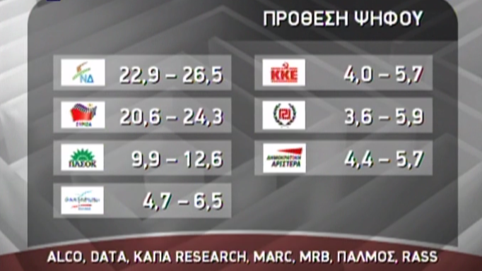 Οριακό προβάδισμα της Νέας Δημοκρατίας έναντι του ΣΥ.ΡΙΖ.Α. έδειξαν οι περισσότερες δημοσκοπήσεις που διεξήχθησαν τις τελευταίες ημέρες και οι οποίες παρουσιάστηκαν πριν από λίγο στην εκπομπή “Λαβύρινθος” της ΕΤ3.Στην πρόθεση ψήφου η Νέα Δημοκράτια συγκεντρώνει ποσοστό από 22,9% μέχρι 26,5%, ενώ ο ΣΥ.ΡΙΖ.Α. από 20,6% έως 24,3%.