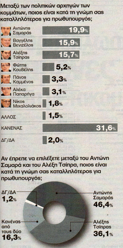 Για καταλληλότερος πρωθυπουργός:Α. Σαμαράς 19,9%Β. Βενιζέλος 15,9%Αλ. Τσίπρας 15,7%Φ. Κουβέλης 5,2%Π. Καμμένος 3,3%Αλ. Παπαρήγα 3,1%Ν. Μιχαλολιάκος 1,8%Αλλος 1,5%Κανένας 31,6% Μεταξύ Σαμαρά και Τσίπρα:Σαμαράς 46,4%Τσίπρας 36,1%Κανένας από τους δύο 16,3%