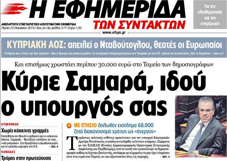 Να περιβάλει με το μανδύα του ΕΔΟΕΑΠ το σημερινό ( 23-10-14) πρωτοσέλιδο της «Εφημερίδας των Συντακτών» για το οποίο και θα προσφύγω στη δικαιοσύνη.