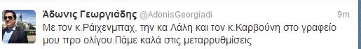 “Με τον κ.Ράιχενμπαχ, την κα Λάλη και τον κ.Καρβούνη στο γραφείο μου προ ολίγου. Πάμε καλά στις μεταρρυθμίσεις”, ήταν το σχόλιο του Άδωνι Γεωργιάδη.