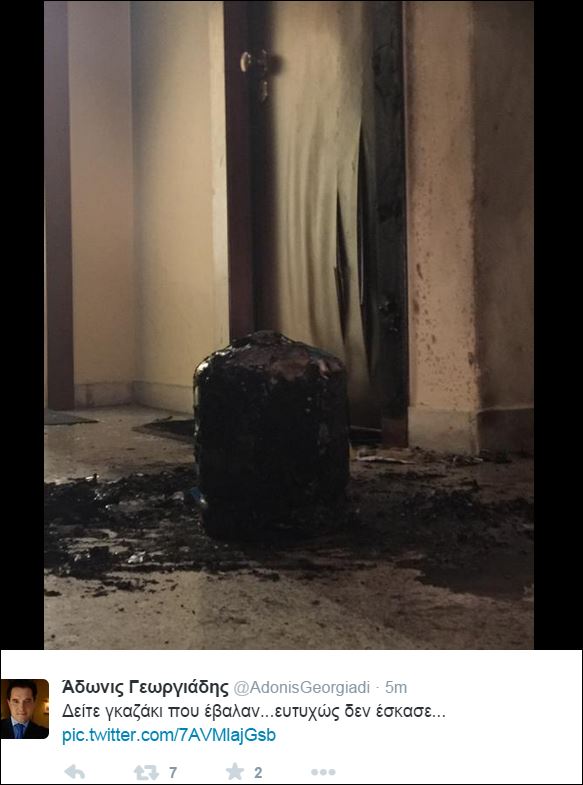 Δείτε τις φωτογραφίες που ανέβασε πριν από λίγο ο ίδιος ο Άδωνις Γεωργιάδης στο twitter για την επίθεση με γκαζάκια στο γραφείο του.