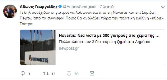 «Τι δηλαδή συνέχιζαν οι γιατροί να λαδώνονται από τη Novartis και επί ΣΥΡΙΖΑ;;;», έγραψε μεταξύ άλλων ο αντιπρόεδρος της ΝΔ και πρόσθεσε: «Πέφτω από τα σύννεφα! Ποιος θα αναλάβει τώρα την πολιτική ευθύνη «κύριε» Τσίπρα;».
