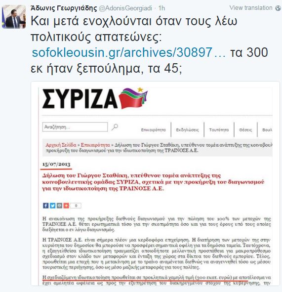 Ο αντιπρόεδρος της ΝΔ παραπέμπει σε μία δήλωση του Ιουλίου του 2013 από τον Γιώργο Σταθάκη ο οποίος έκανε λόγο για «προκλητικά χαμηλή τιμή» αναφερόμενος στα 300 εκατομμύρια ευρώ που αξίωνε η τότε κυβέρνηση για την ιδιωτικοποίηση της ΤΡΑΙΝΟΣΕ.