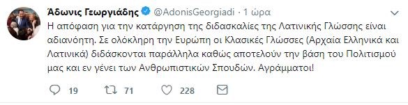 Επίθεση στο υπουργείο Παιδείας εξαπέλυσε μέσω Twitter ο αντιπρόεδρος της ΝΔ, Άδωνις Γεωργιάδης σχολιάζοντας τις σημερινές ανακοινώσεις του Κώστα Γαβρόγλου για τις αλλαγές στις πανελλαδικές εξετάσεις.Συγκεκριμένα, στην ανάρτησή του ο κ. Γεωργιάδης αναφέρεται στην «έξοδο» των λατινικών από τις πανελλαδικές αναφέροντας:«Η απόφαση για την κατάργηση της διδασκαλίες της Λατινικής Γλώσσης είναι αδιανόητη. Σε ολόκληρη την Ευρώπη οι Κλασικές Γλώσσες (Αρχαία Ελληνικά και Λατινικά) διδάσκονται παράλληλα καθώς αποτελούν την βάση του Πολιτισμού μας και εν γένει των Ανθρωπιστικών Σπουδών. Αγράμματοι!».Δείτε την ανάρτησή του Άδωνι Γεωργιάδη: