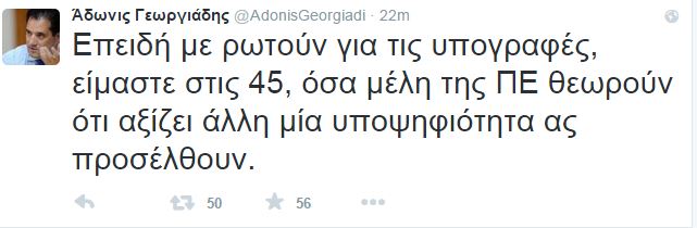 Τον αριθμό των υπογραφών που έχει συγκεντρώσει αποκαλύπτει μέσω Twitter ο Άδωνις Γεωργιάδης καλώντας όσα μέλη της Πολιτικής Επιτροπής της ΝΔ πιστεύουν πως αξίζει να υπάρχει άλλη μια υποψηφιότητα να υπογράψουν τη δική του.