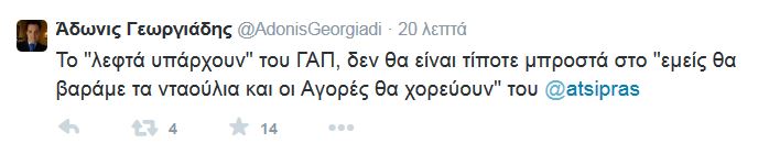 «Το “λεφτά υπάρχουν” του ΓΑΠ, δεν θα είναι τίποτε μπροστά στο “εμείς θα βαράμε τα νταούλια και οι Αγορές θα χορεύουν” του @atsipras», αναφέρει στο «τιτίβισμά» του ο κοινοβουλευτικός εκπρόσωπος της Νέας Δημοκρατίας.