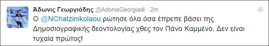 «Ο Νίκος Χατζηνικολάου ρώτησε όλα όσα έπρεπε βάσει της Δημοσιογραφικής δεοντολογίας χθες τον Πάνο Καμμένο. Δεν είναι τυχαία πρώτος!» σχολίασε ο κ. Γεωργιάδης.