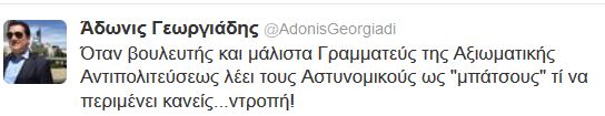 “Όταν βουλευτής και μάλιστα Γραμματεύς της Αξιωματικής Αντιπολιτεύσεως λέει τους Αστυνομικούς ως “μπάτσους” τί να περιμένει κανείς…ντροπή!”, ήταν το σχόλιο του βουλευτή της Νέας Δημοκρατίας.