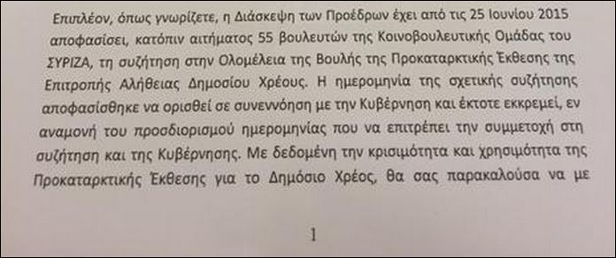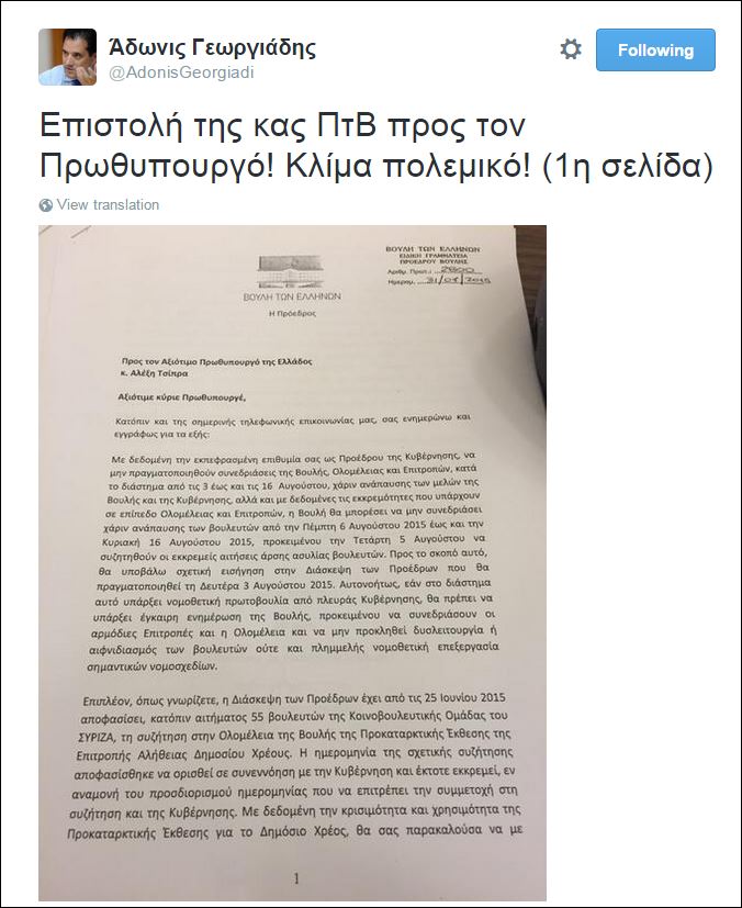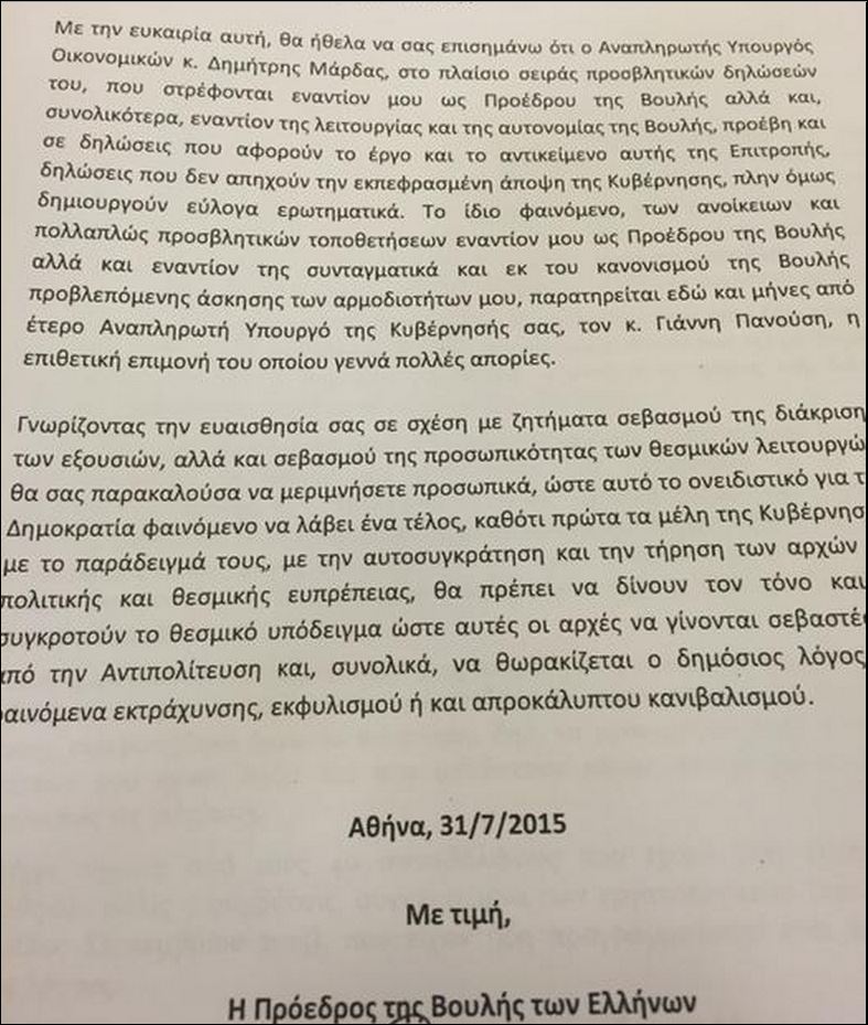 Επιθέσεις υπουργών σε βάρος της καταγγέλλει η πρόεδρος της βουλής Ζωή Κωνσταντοπούλου με επιστολή της στον Πρωθυπουργό Αλέξη Τσίπρα. Την επιστολή ανέβασε στο Twitter ο Άδωνις Γεωργιάδης σχολιάζοντας ότι στην πρώτη σελίδα κυριαρχεί το “πολεμικό κλίμα” ενώ στην άλλη το ενδιαφέρον βρίσκεται στα όσα γράφει για τον Γιάννη Πανούση και τον Δημήτρη Μάρδα.