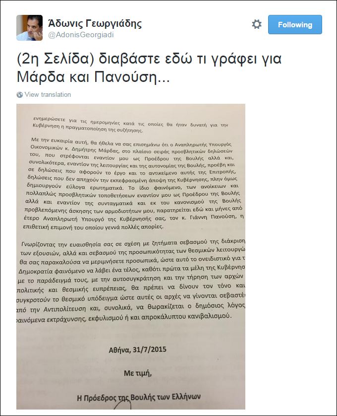 Ο Άδωνις “καρφώνει” την επιστολή διαμαρτυρίας της Κωνσταντοπούλου στον Τσίπρα