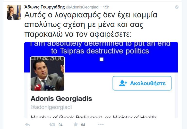 Ψέυτικο λογαριασμό στο twitter που υποτίθεται είναι δικός του εντόπισε ο βουλευτής της ΝΔ και υποψήφιος του κόμματος Άδωνις Γεωργιάδης και αμέσως έσπευσε να πληροφορήσει τους χρήστες του διαδικτύου ότι δεν έχει κάποια σχέση…