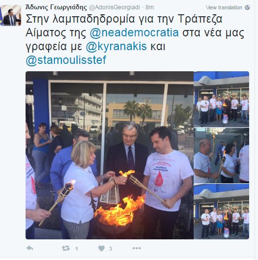 Λαμπαδηδρόμος έγινε για λίγο ο αντιπρόεδρος της ΝΔ  Άδωνις Γεωργιάδης. Ο κ. Γεωργιάδης συμμετείχε στη λαμπαδηδρομία για την Τράπεζα Αίματος της Νέας Δημοκρατίας και ανέβασε φωτογραφίες στο Twitter.
