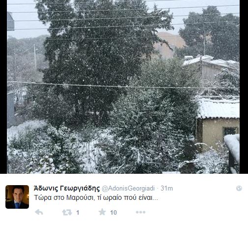 Το «λευκό» τοπίο δεν άφησε ασυγκίνητο ούτε τον Άδωνι Γεωργιάδη που ξεκίνησε την ημέρα του απαθανατίζοντας το χιονισμένο Μαρούσι, όπως φαίνεται στη φωτογραφία που ανέβασε στον προσωπικό του λογαριασμό στο Twitter.