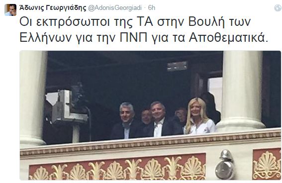 Ο Άδωνις Γεωργιάδης φωτογράφισε τον Γιώργο Πατούλη καθώς και την εντυπωσιακή σύζυγό του, Μαρίνα Σταυράκη, η οποία τον συνόδεψε στη Βουλή και στη συνέχεια ανέβασε τη φωτογραφία στο λογαριασμό του στο twitter.