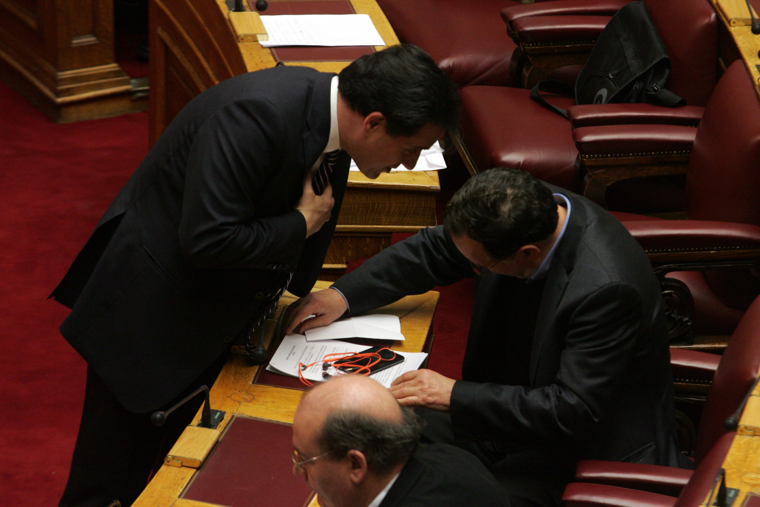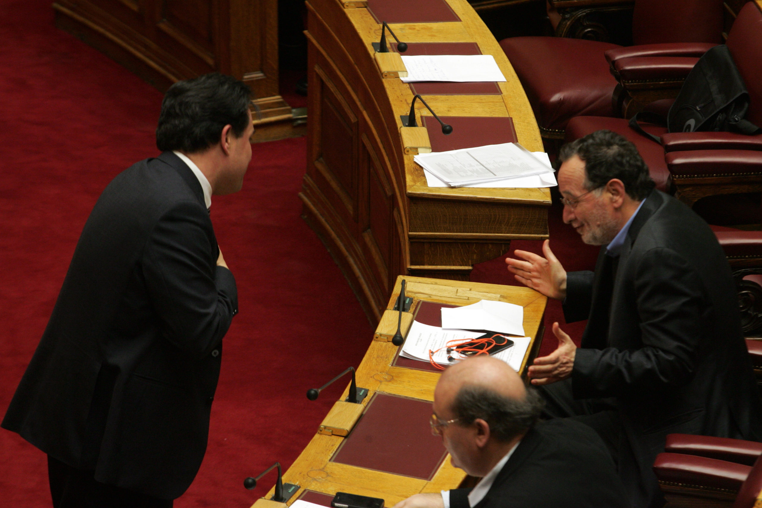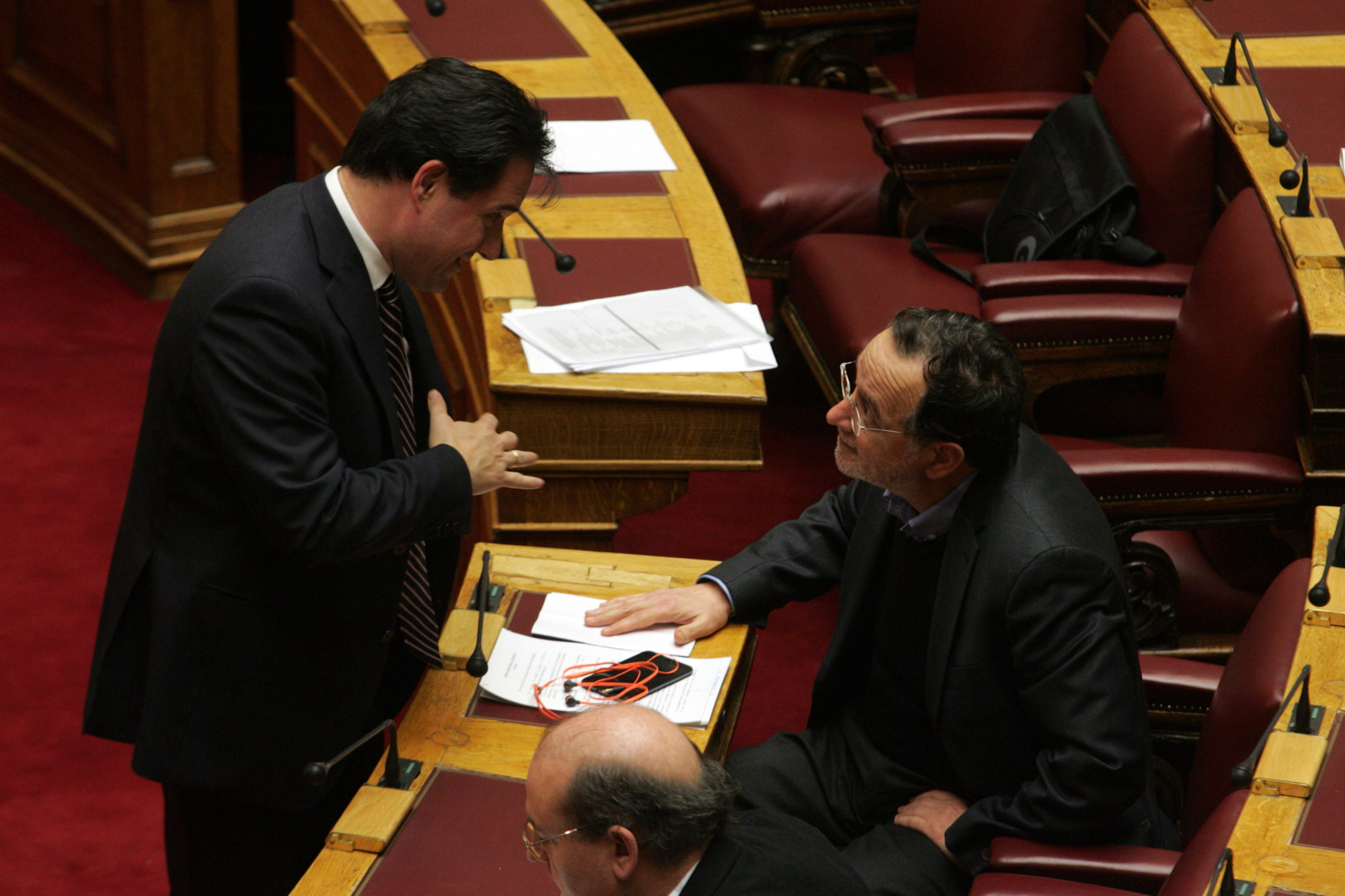 Μία σύντομη συνομιλία είχαν ο Παναγιώτης Λαφαζάνης και ο Άδωνις Γεωργιάδης, κατά τη διάρκεια της συζήτησης στην Ολομέλεια της Βουλής, για τις προγραμματικές δηλώσεις της Κυβέρνησης.