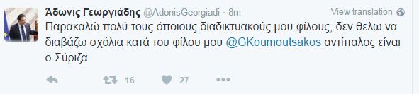 Έκκληση προς τους διαδικτυακούς του φίλους να μην κάνουν σχόλια κατά του Γιώργου Κουμουτσάκου, έκανε ο Άδωνις Γεωργιάδης.