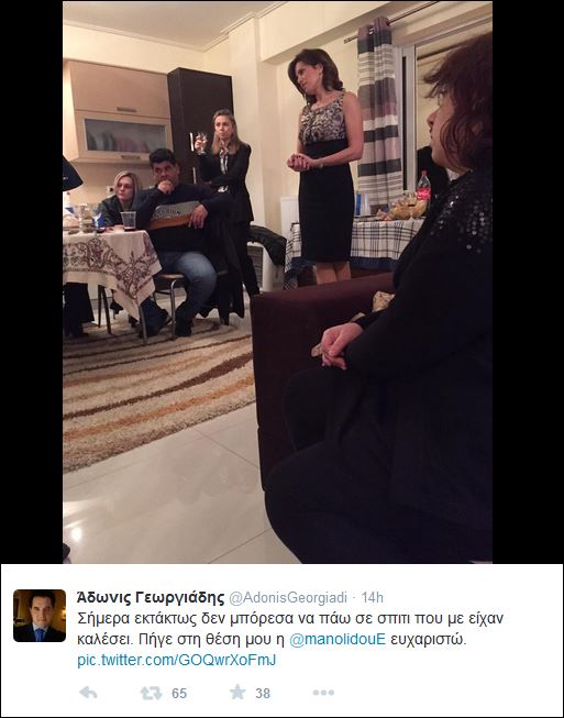 Μια έκπληξη περίμενε τους ψηφοφόρους του Άδωνι Γεωργιάδη στη χθεσινή προεκλογική συγκέντρωση του υποψηφίου βουλευτή με τη Νέα Δημοκρατία. Η Ευγενία Μανωλίδου εμφανίστηκε στη συγκέντρωση και μίλησε με τους πολίτες καθώς οι αυξημένες υποχρεώσεις του κ. Γεωργιάδη δεν του επέτρεψαν να δώσει το παρών. Μάλιστα, ευχαρίστησε τη σύζυγό του για την παρουσία της, μέσω Twitter, ανεβάζοντας και φωτογραφία από την εκδήλωση.