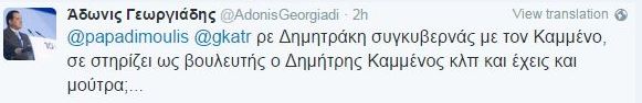 «Ρε Δημητράκη συγκυβερνάς με τον Καμμένο, σε στηρίζει ως βουλευτής ο Δημήτρης Καμμένος κλπ και έχεις και μούτρα;» έγραψε ο κ. Γεωργιάδης.