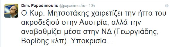 Στον Ευρωβουλευτή του ΣΥΡΙΖΑ Δημήτρη Παπαδημούλη, ο οποίος στον λογαριασμό του στο twitter σχολίασε το γεγονός ότι «ο Κυριάκος Μητσοτάκης χαιρετίζει την ήττα του ακροδεξιού στην Αυστρία αλλά την αναβαθμίζει μέσα στην ΝΔ (Γεωργιάδης, Βορίδης κλπ)», απάντησε με δική του ανάρτηση στο twitter ο Αντιπρόεδρος της ΝΔ, Άδωνις Γεωργιάδης.