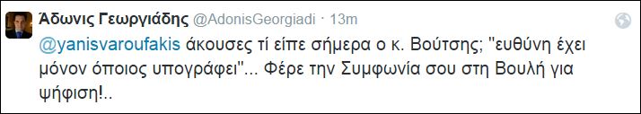 «@yanisvaroufakis άκουσες τί είπε σήμερα ο κ. Βούτσης; “ευθύνη έχει μόνον όποιος υπογράφει”… Φέρε την Συμφωνία σου στη Βουλή για ψήφιση!..», έγραψε στο twitter ο κ. Γεωργιάδης.