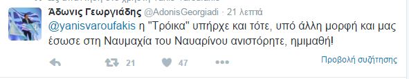 Συγκεκριμένα, ο Άδωνις Γεωργιάδης έγραψε: «Γιάνη Βαρουφάκη, η τρόικα υπήρχε και τότε, υπό άλλη μορφή και μας έσωσε στη Ναυμαχία του Ναυαρίνου ανιστόρητε, ημιμαθή».