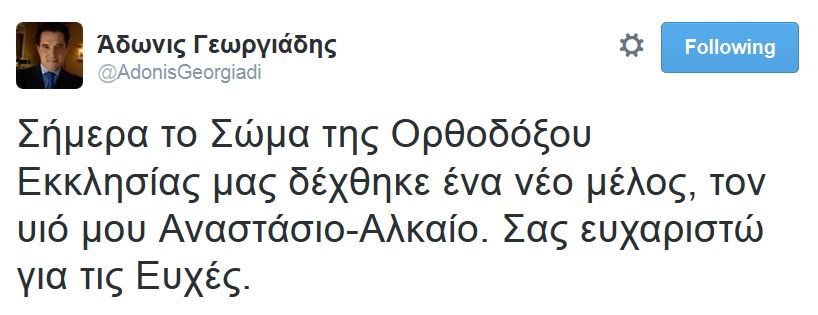 Τον γιο του βάφτισε σήμερα ο Άδωνις Γεωργιάδης. Το ευχάριστο γεγονός ανακοίνωσε ο ίδιος μέσω Twitter.