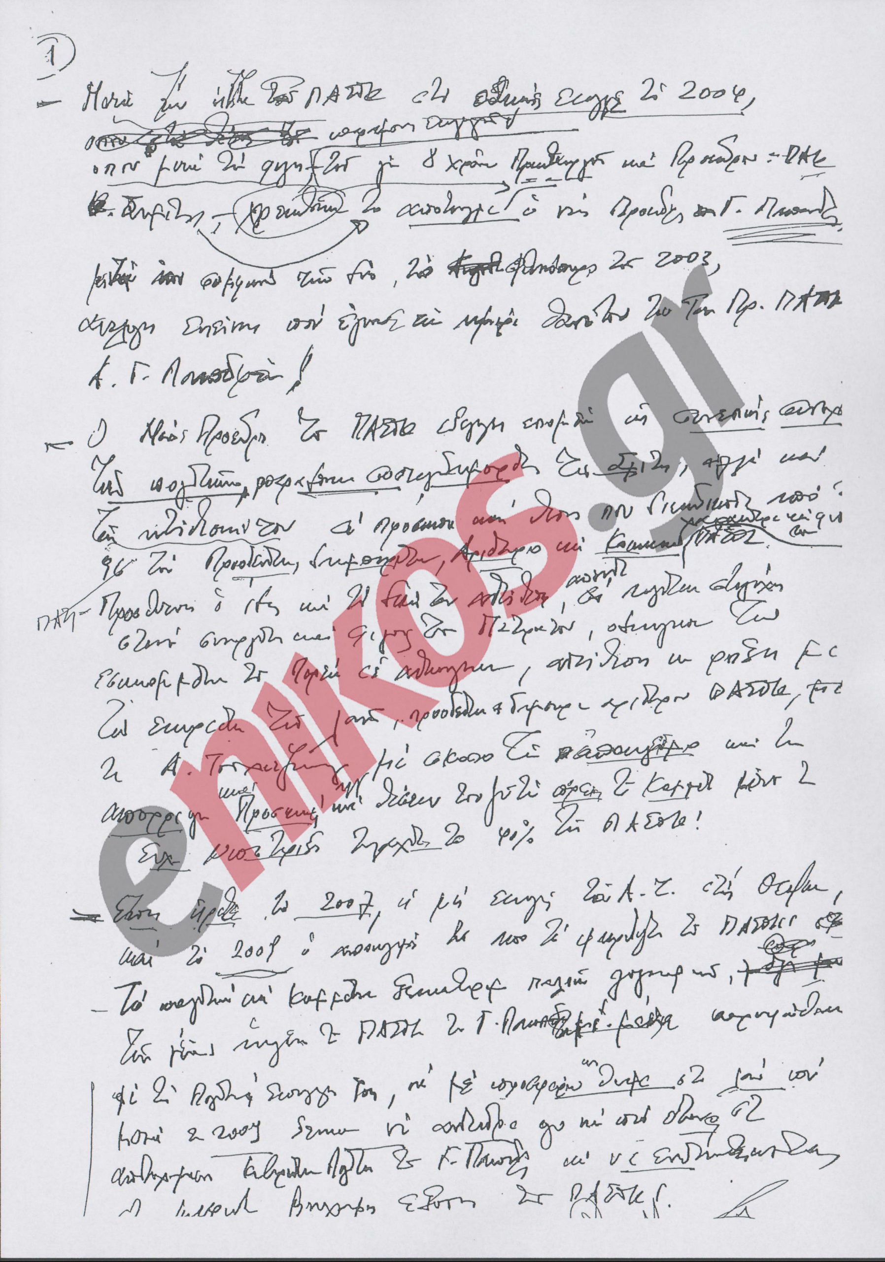 Χαρακτηριστικό είναι ένα ακόμη χαρτί από τις σημειώσεις του που προφανώς απευθύνεται και πάλι στον συνεργάτη του και λέει χαρακτηριστικά: «Οι πληροφορίες μου μού λένε ότι εσύ τα κατάφερες και τα βρήκατε με την ηγεσία του ΠΑΣΟΚ. Από τη στιγμή που τα βρήκες με αυτούς μόνο για σένα βέβαια, τα έχεις σπάσεις μαζί μου». Και συνεχίζει: «Οι δρόμοι χωρίζουν υποχρεωτικά». «Ένας όρος», τονίζει: «Ανάγκη ενός τίμιου ξεκαθαρίσματος του συνολικού έργου μας από 1996 μέχρι σήμερα».