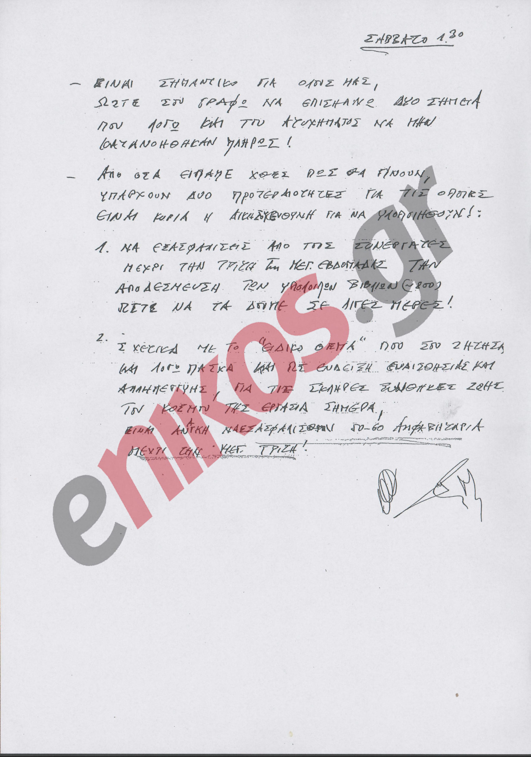 «Σου γράφω να επισημάνω δύο σημεία που λόγω και του ατυχήματος να μην κατανοήθηκαν πλήρως. Από όσα είπαμε χθες πως θα γίνουν υπάρχουν δύο προτεραιότητες για τις οποίες είναι κύρια η δική σου ευθύνη για να υλοποιηθούν»: