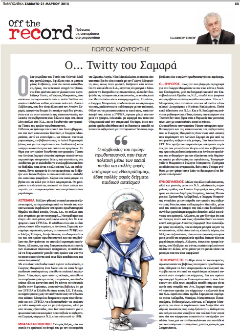 Δείτε τι έγραφε ο αρθρογράφος των “Παραπολιτικών” ,Νίκος Σίμος, το Σάββατο 21 Μαρτίου του 2015.