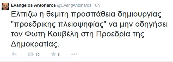“Ελπίζω η θεμιτή προσπάθεια δημιουργίας “προεδρικής πλειοψηφίας” να μην οδηγήσει τον Φώτη Κουβέλη στην Προεδρία της Δημοκρατίας” έγραψε ο πρώην κυβερνητικός εκπρόσωπος της κυβέρνησης Καραμανλή.
