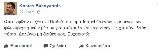 Ο Περιφερειάρχης Στερεάς Ελλάδας, Κώστας Μπακογιάννης διέψευσε τα δημοσιεύματα που τον φέρουν να έχει κόντρα με τον πρόεδρο της ΝΔ και θείο του, Κυριάκο Μητσοτάκη, με αφορμή την παρουσία του στο Περιφερειακό Αναπτυξιακό Συνέδριο που πραγματοποιήθηκε στη Λαμία.Ο Κώστας Μπακογιάννης έγραψε χαρακτηριστικά στο Facebook:«Ώπα. Σφίξαν οι ζέστες! Παιδιά το τερματίσαμε! Οι ενδιαφερόμενοι των φιλοκυβερνητικών μέσων για σπέκουλα και κακεντρέχειες χτυπάνε λάθος πόρτα. Δηλώνω μη διαθέσιμος. Ευχαριστώ»