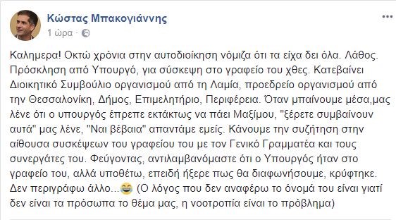 Για το … κρυφτό που παίζει μαζί του υπουργός της κυβέρνησης έκανε λόγο σε ανάρτησή του στο Facebook ο περιφερειάρχης Στερεάς Ελλάδας, Κώστας Μπακογιάννης.«Οκτώ χρόνια στην αυτοδιοίκηση νόμιζα ότι τα είχα δει όλα. Λάθος. Πρόσκληση από Υπουργό, για σύσκεψη στο γραφείο του χθες. Κατεβαίνει Διοικητικό Συμβούλιο οργανισμού από τη Λαμία, προεδρείο οργανισμού από την Θεσσαλονίκη, Δήμος, Επιμελητήριο, Περιφέρεια. Όταν μπαίνουμε μέσα, μας λένε ότι ο υπουργός έπρεπε εκτάκτως να πάει Μαξίμου, “ξέρετε συμβαίνουν αυτά” μας λένε, “Ναι βέβαια” απαντάμε εμείς. Κάνουμε την συζήτηση στην αίθουσα συσκέψεων του γραφείου του με τον Γενικό Γραμματέα και τους συνεργάτες του», έγραψε ο κ. Μπακογιάννης και προσέθεσε: «Φεύγοντας, αντιλαμβανόμαστε ότι ο Υπουργός ήταν στο γραφείο του, αλλά υποθέτω, επειδή ήξερε πως θα διαφωνήσουμε, κρύφτηκε. Δεν περιγράφω άλλο…(Ο λόγος που δεν αναφέρω το όνομά του είναι γιατί δεν είναι τα πρόσωπα το θέμα μας, η νοοτροπία είναι το πρόβλημα)».