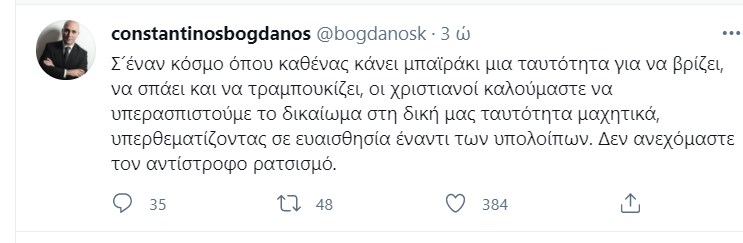 Ο Κωνσταντίνος Μπογδάνος συνέχισε στο ίδιο μήκος κύματος και με δεύτερη ανάρτηση: “Σ´έναν κόσμο όπου καθένας κάνει μπαϊράκι μια ταυτότητα για να βρίζει, να σπάει και να τραμπουκίζει, οι χριστιανοί καλούμαστε να υπερασπιστούμε το δικαίωμα στη δική μας ταυτότητα μαχητικά, υπερθεματίζοντας σε ευαισθησία έναντι των υπολοίπων. Δεν ανεχόμαστε τον αντίστροφο ρατσισμό” έγραψε.