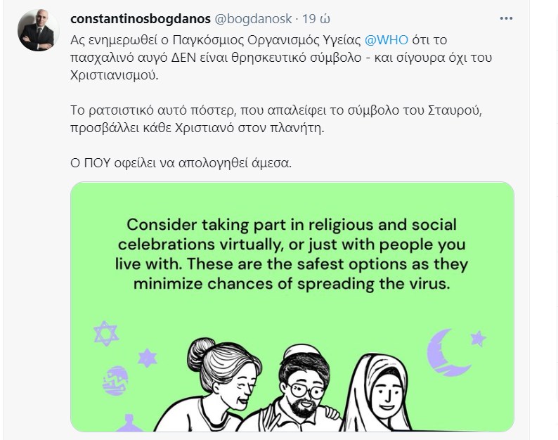 Την έντονη αντίδραση του βουλευτή της Νέας Δημοκρατίας Κωνσταντίνου Μπογδάνου προκάλεσε ένα πόστερ του Παγκόσμιου Οργανισμού Υγείας σχετικά με τον εορτασμό του Πάσχα. «Ας ενημερωθεί ο Παγκόσμιος Οργανισμός Υγείας WHO ότι το πασχαλινό αυγό ΔΕΝ είναι θρησκευτικό σύμβολο – και σίγουρα όχι του Χριστιανισμού. Το ρατσιστικό αυτό πόστερ, που απαλείφει το σύμβολο του Σταυρού, προσβάλλει κάθε Χριστιανό στον πλανήτη. Ο ΠΟΥ οφείλει να απολογηθεί άμεσα» έγραψε ο βουλευτής.
