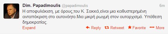 «Η αποφυλάκιση, με όρους, του Κ. Σακκά, είναι μια καθυστερημένη ανταπόκριση στο αυτονόητο. Μία μικρή ρωγμή στον αυταρχισμό. Υπόθεση δημοκρατίας», είπε χαρακτηριστικά ο κ. Παπαδημούλης.