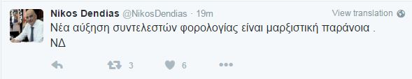 Τα σενάρια για αύξηση των συντελεστών φορολογίας σχολιάζει ο Νίκος Δένδιας με ανάρτηση στον προσωπικό του λογαριασμό στο Twitter, κάνοντας λόγο για μαρξιστική παράνοια.