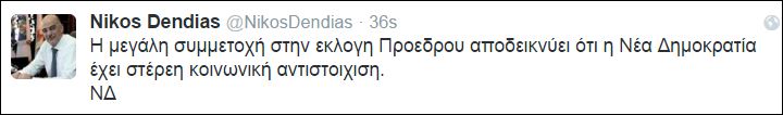 Την εκλογική διαδικασία για την ανάδειξη προέδρου στη Νέα Δημοκρατία και τη μεγάλη συμμετοχή του κόσμου, σχολίασε στο twitter ο βουλευτής του κόμματος, Νίκος Δένδιας.