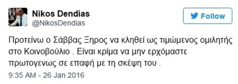 «Προτείνω ο Σάββας Ξηρός να κληθεί ως τιμώμενος ομιλητής στο Κοινοβούλιο . Είναι κρίμα να μην ερχόμαστε πρωτογενώς σε επαφή με τη σκέψη του», έγραψε χαρακτηριστικά ο Νίκος Δένδιας.