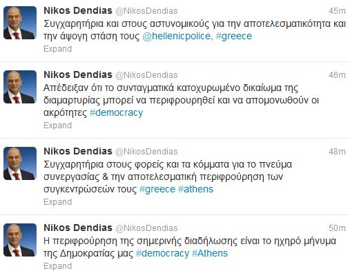 ”Η περιφρούρηση της σημερινής διαδήλωσης είναι το ηχηρό μήνυμα της Δημοκρατίας μας. Συγχαρητήρια και στους φορείς και τα κόμματα για το πνεύμα συνεργασίας και την αποτελεσματική περιφρούρηση των συγκεντρώσεών τους. Απέδειξαν ότι το συνταγματικά κατοχυρωμένο διακαίωμα της διαμαρτυρίας μπορεί να περιφρουρηθεί και να απομονωθούν οι ακρότητες. Συγχαρητήρια και στους αστυνομικούς για την αποτελεσματικότητα και την άψογη στάση τους”, έγραψε στον λογαριασμό του στο twitter, ο Νίκος Δένδιας.