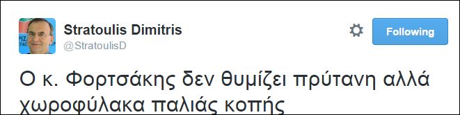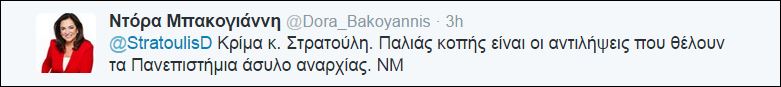 Ένα διάλογο είχαν μέσω twitter ο Δημήτρης Στρατούλης και η Ντόρα Μπακογιάννη με αφορμή την ένταση που επικράτησε στο Πανεπιστήμιο Αθηνών ανάμεσα στον πρύτανη Θεόδωρο Φορτσάκη και τους φοιτητές.