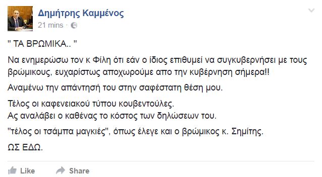 Στον πρώην υπουργό Παιδείας Νίκο Φίλη απάντησε μέσω του λογαριασμού του στο Facebook ο βουλευτής των Ανεξαρτήτων Ελλήνων Δημήτρης Καμμένος με αφορμή την πρόσφατη ομιλία του κ. Φίλη στην κεντρική επιτροπή του ΣΥΡΙΖΑ όπου έκανε άνοιγμα στο ΠΑΣΟΚ «έστω κι αν βρωμάει», όπως είπε χαρακτηριστικά.«Να ενημερώσω τον κ. Φίλη ότι εάν ο ίδιος επιθυμεί να συγκυβερνήσει με τους βρώμικους, ευχαρίστως αποχωρούμε από την κυβέρνηση σήμερα. Αναμένω την απάντησή του στην σαφέστατη θέση μου» επεσήμανε ο κ. Καμμένος.«Τέλος οι καφενειακού τύπου κουβεντούλες. Ας αναλάβει ο καθένας το κόστος των δηλώσεων του. “Τέλος οι τσάμπα μαγκιές”, όπως έλεγε και ο βρώμικος κ. Σημίτης. Ως εδώ» πρόσθεσε ο βουλευτής των ΑΝΕΛ.