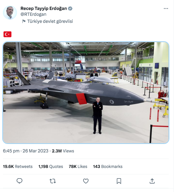 Και καλύτερη μαρτυρία δεν υπάρχει από την φωτογραφία που δημοσίευσε ο Ερντογάν στον λογαριασμό του στο Twitter, με το νέο drone που σχεδίασε κι ανέπτυξε η τουρκική βιομηχανία (σ.σ. για να ακριβολογούμε, η εταιρεία του γαμπρού του). Πρόκειται για το Kizilelma ή «Κόκκινη Μηλιά» όπως είναι στα ελληνικά η απόδοσή του.