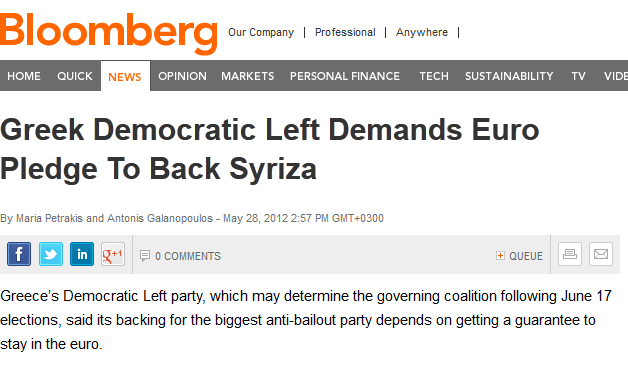 “Η Δημοκρατική Αριστερά, ενός κόμματος, που ενδέχεται να καθορίσει τον σχηματισμό κυβερνητικού συνασπισμού στις 17 Ιουνίου δήλωσε πως η στήριξή του στο μεγαλύτερο αντιμνημονιακό κόμμα εξαρτάται από την παροχή εγγυήσεων για την παραμονή της Ελλάδας στο ευρώ”, αναφέρει το πρακτορείο Bloomberg στο οποίο παραχώρησε συνέντευξη ο Φώτης Κουβέλης.”Έχουμε δύο “κόκκινες γραμμές”: η μια αφορά μια πολιτική που θα εξασφαλίζει τη σταθερή παρουσία της χώρας στην Ευρώπη, το ευρώ, την Ευρωζώνη και η άλλη αφορά στη σταδιακή απαγκίστρωση της χώρας από τους όρους του Μνημονίου” ανέφερε ο κ. Κουβέλης.”Όλα τα παραπάνω πρέπει να ξεκαθαριστούν, καθώς οι “κόκκινες γραμμές” μπορεί να υπάρχουν, αλλά οι πολιτικές, που ακολουθεί κανείς είναι που έχουν τελικά σημασία”, συμπλήρωσε. “Η έξοδος της Ελλάδας από την ευρωζώνη σημαίνει πολλά και σημαντικά προβλήματα”, τόνισε ο κ. Κουβέλης. “Δεν μπορώ να αποκλείσω ότι είναι μία πιθανή επιλογή των εταίρων μας. Ένα τέτοιο γεγονός, ανεξαρτήτως των τεράστιων συνεπειών για την Ελλάδα, θα δημιουργήσει επίσης προβλήματα σε άλλες χώρες της Ευρωζώνης”.Ο κ. Κουβέλης ανέφερε ότι υπάρχει αναγνώριση σε Ευρωπαικό επίπεδο, καθώς γίνονται συζητήσεις για τον περιορισμό της ανεργίας και την τόνωση της ανάπτυξης που μπορούν να βοηθήσουν μία νέα ελληνική κυβέρνηση να αναθεωρήσει σταδιακά ορισμένους από τους όρους του μνημονίου.”Οι εύκολες λύσεις των περικοπών σε μισθούς και συντάξεις σε αντάλλαγμα της χρηματοδότησης, έχουν οδηγήσει το 30% του ελληνικού πληθυσμού να ζει κάτω από το όριο της φτώχειας, με την μεσαία τάξη να εξαφανίζεται και η ανεργία να καλπάζει”, είπε.