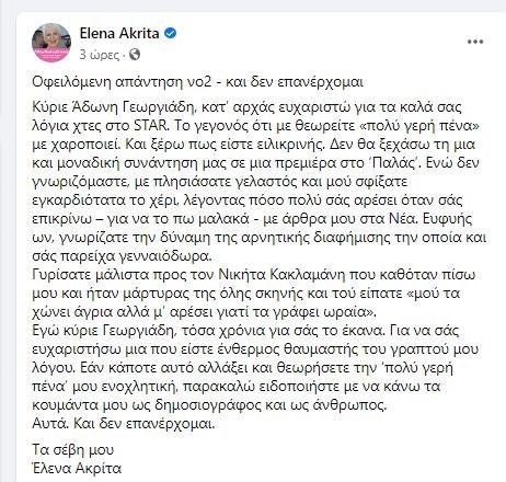 Οι δύο νέες αναρτήσεις από την Έλενα Ακρίτα έγιναν χθες. Στην πρώτη ζήτησε συγγνώμη από την Ευγενία Μανωλίδου, αφήνοντας ωστόσο αιχμές εναντίον της και στη δεύτερη αναφέρθηκε στον Άδωνι Γεωργιάδη.