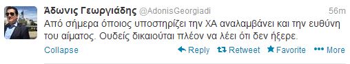Μέσω του προσωπικού του λογαριασμού στο twitter, σχολίασε νωρίτερα τα όσα συνέβησαν τις τελευταίες ώρες με την Χρυσή Αυγή, ο υπουργός Υγείας Άδωνις Γεωργιάδης.